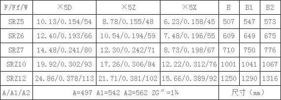 表5、SRZ散熱器散熱面積F(m2),通風凈截面積Ff(m2),參考重量W(Kg),有關尺寸(mm)一覽續表