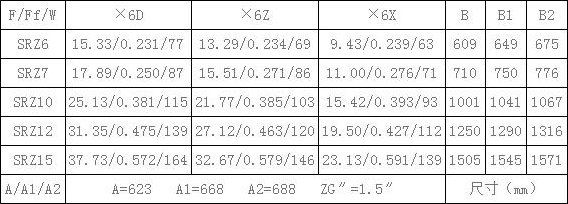 表6、SRZ散熱器散熱面積F(m2),通風凈截面積Ff(m2),參考重量W(Kg),有關尺寸(mm)一覽續表