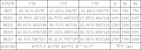 表7、SRZ散熱器散熱面積F(m2),通風凈截面積Ff(m2),參考重量W(Kg),有關尺寸(mm)一覽續表