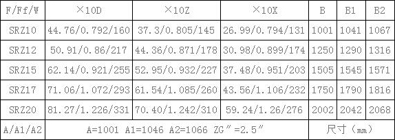 表4、SRZ散熱器散熱面積F(m2),通風凈截面積Ff(m2),參考重量W(Kg),有關尺寸(mm)一覽表